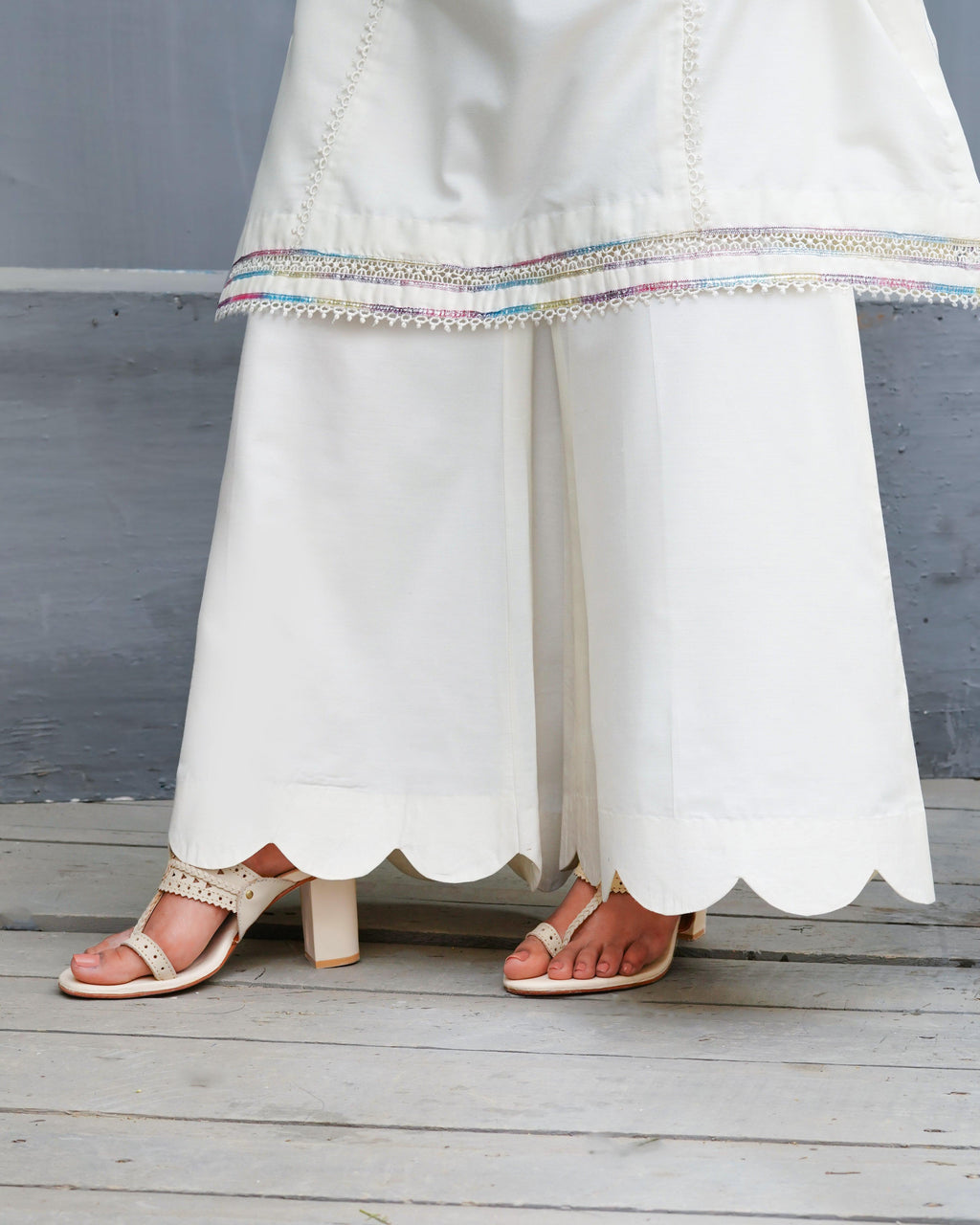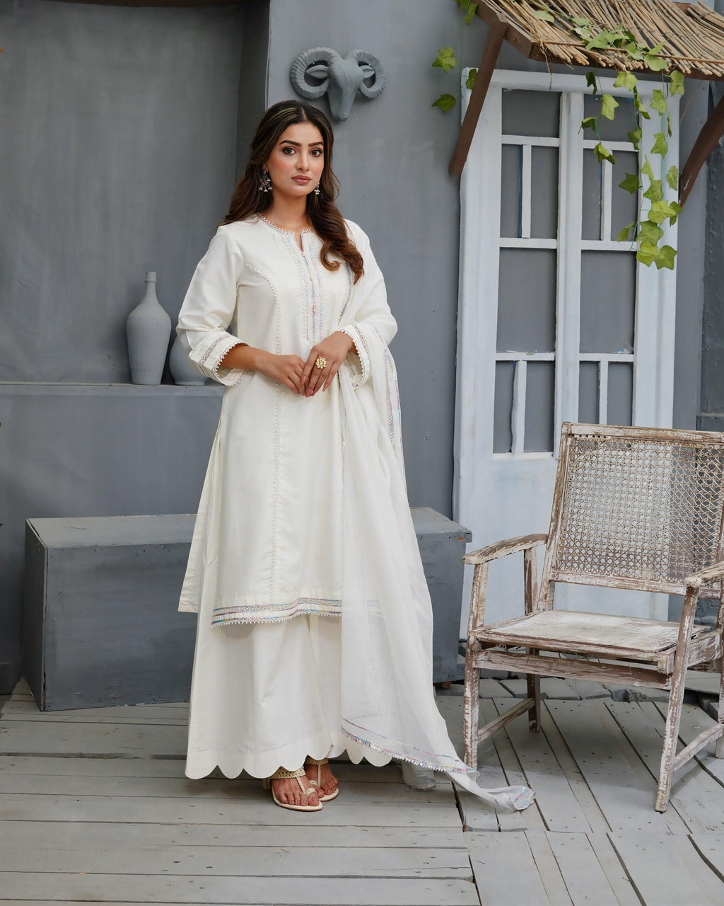 Pearl White - Cotton silk suit embrllished with laces and Gota details on shirt and dupatta, paired with scallop palazzo pants.