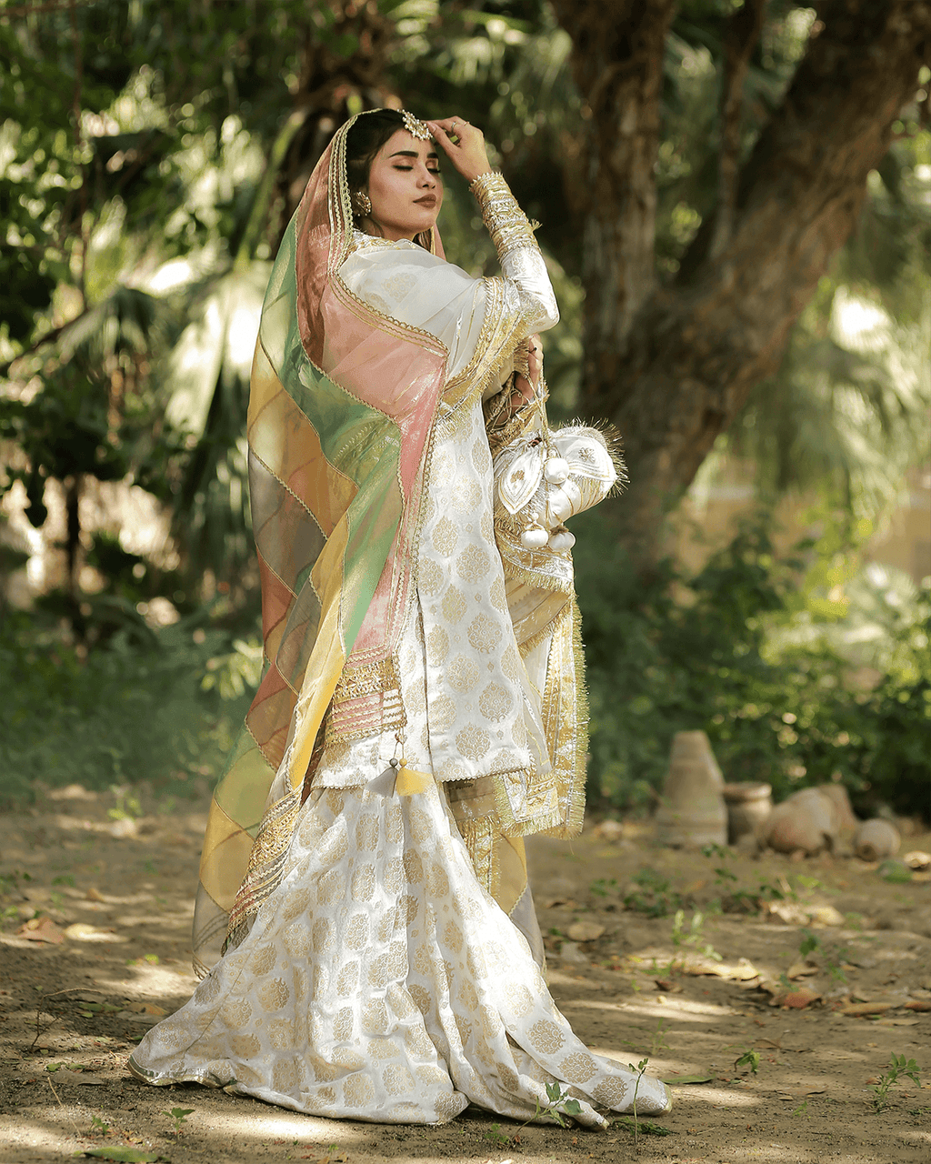 Saahiba - An old School flared satin brocade Gharara with knee length shirt styled with white organza Gota embellished dupatta and handmade latkans.