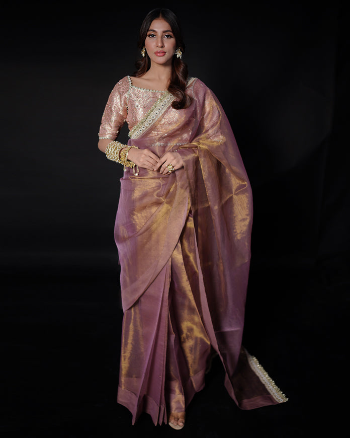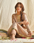 Konpal - A formal 3 piece outfit includes Rose pink tissue Kalidar frock with hand embroidered Gota work and texture on sleeves and straight pants paired up with beige crushed...