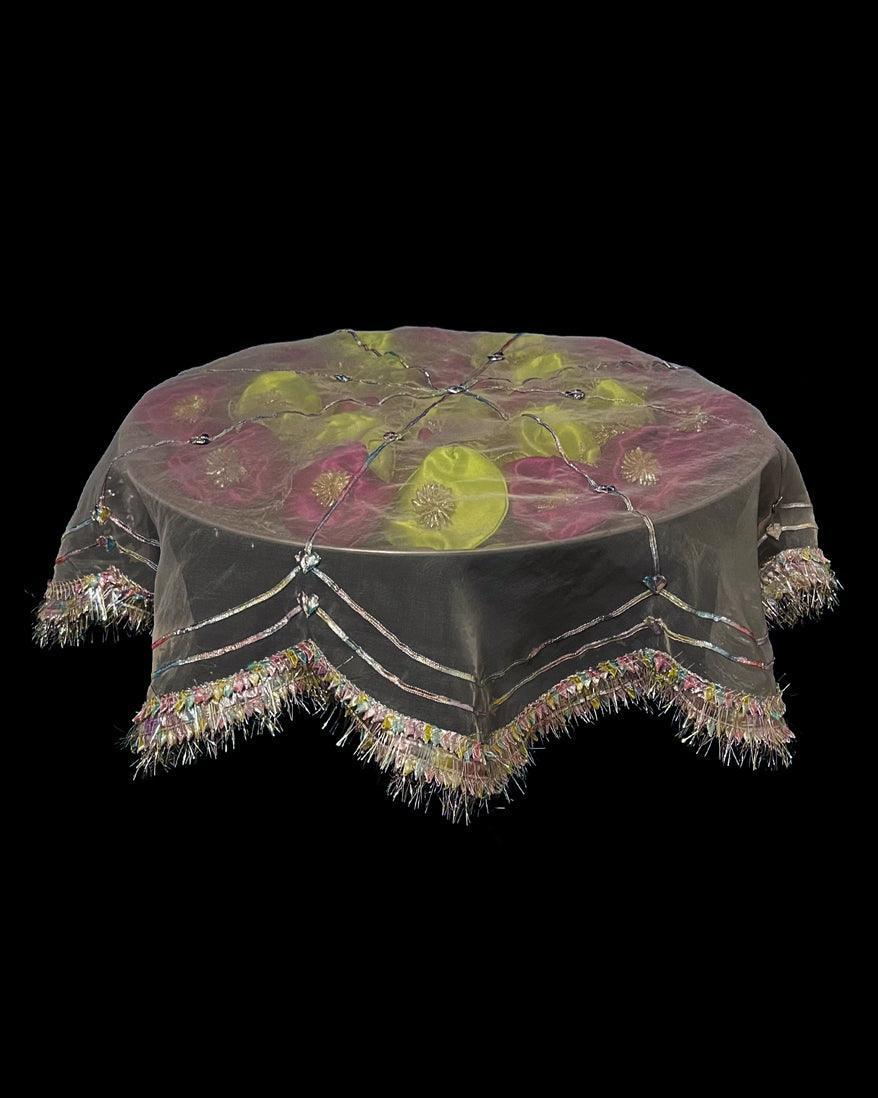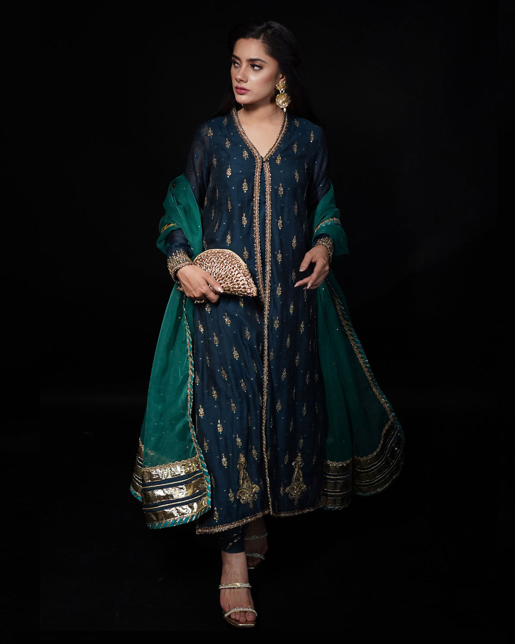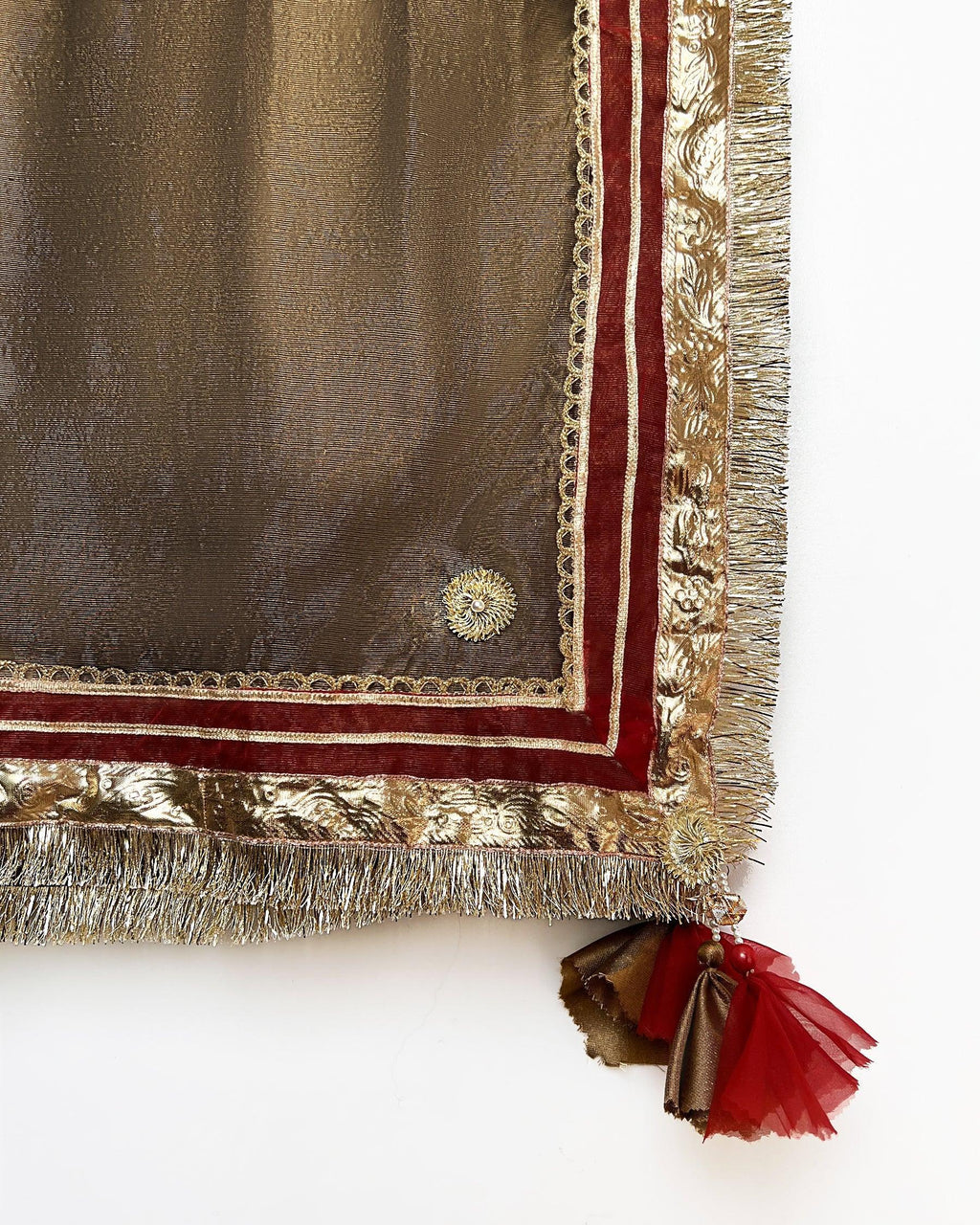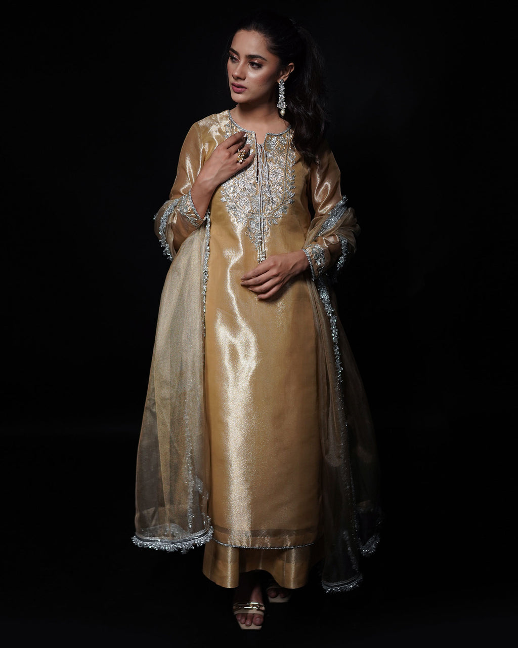 Konpal - A formal 3 piece outfit includes Rose pink tissue Kalidar frock with hand embroidered Gota work and texture on sleeves and straight pants paired up with beige crushed dupatta bordered with Gota and tassels.