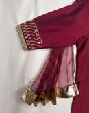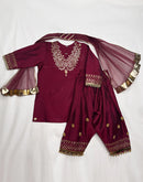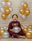 A cotton-silk kameez shalwar with fine hand embroidery on the neck, sleeves, and leg opening, styled beautifully with a pleated organza dupatta for your little girl.