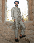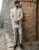 Embroidered Raw silk kurta designed with loop button neck and raw silk pants paired up with embroidered Tehra Altas brocade shrug style prince coat. Color: Grey Includes: Prince Coat, Kurta, Pants...