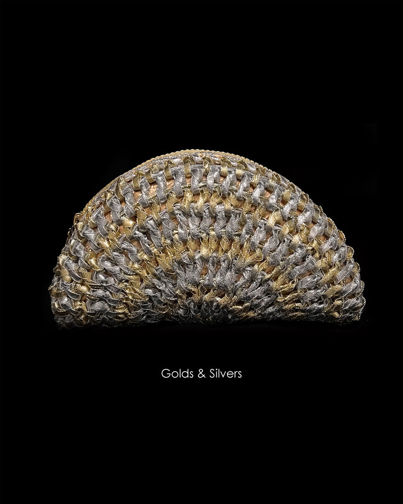 Half moon Gota Crochet Classic Style Clutch Bag overlaid With Hand Crochet Gota mesh with a zip opening.