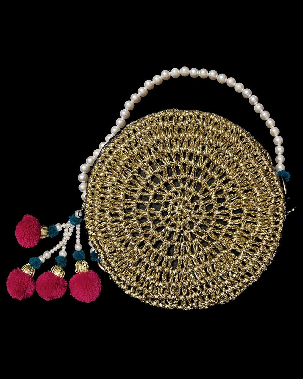 Round small Shoulder bag with overlaid hand crochet mesh enhanced with a handmade fun tassel and a small pearl strap.