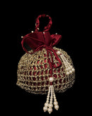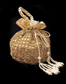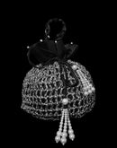 Silk Potli Bag overlaid with hand crochet mesh embellished with Handmade Pearl Tassel string and a Braided wristlet.