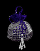 Silk Potli Bag overlaid with hand crochet mesh embellished with Handmade Pearl Tassel string and a Braided wristlet. A Bag  Size: 8x11 inches Handling Options: Tassel Strings & Braided Wristlet Perfect combo...