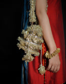 A bag that radiates a mood of classic luxury and effortless style. Golden and silver gota potli bag, handcrafted and adorned with vintage laces for a touch of elegance.