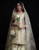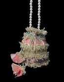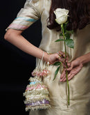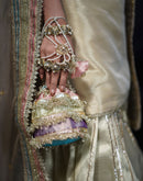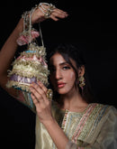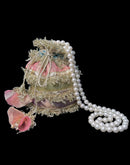 An ethnic potli showcasing a tissue base with intricate gota and kiran work, complemented by a pearl handle and tassels. Ideal for weddings, it enhances any traditional look.