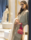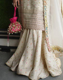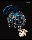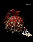 Silk Potli Bag overlaid with hand crochet mesh embellished with Handmade Pearl Tassel string and a Braided wristlet.