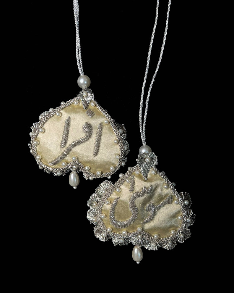 Couple Name Embroidered Tassels adorned with Gota, fringes and pearls.  A pair of handcrafted tassels Perfect for attaching to potli bags, necklines, or other accessories Please WhatsApp your required names along with your ord...