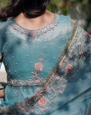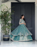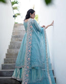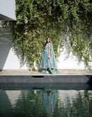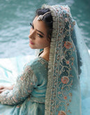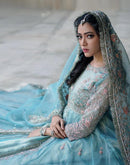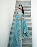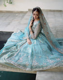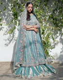 Frona - A delightful Pale turquoise organza front open heavily embellished nakshi, sequins, dabka and resham work peshwas along with the sleeves. The tissue lehenga has sequin boti chatta and an intricately embellished border. The organza dupatta has an exquisitely embellished border with peach pink florals it also has edging of kiran to give it a complete look.