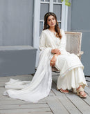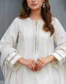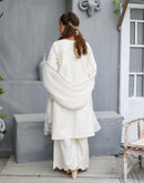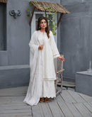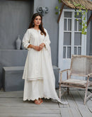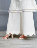 Pearl White - Cotton silk suit embrllished with laces and Gota details on shirt and dupatta, paired with scallop palazzo pants.