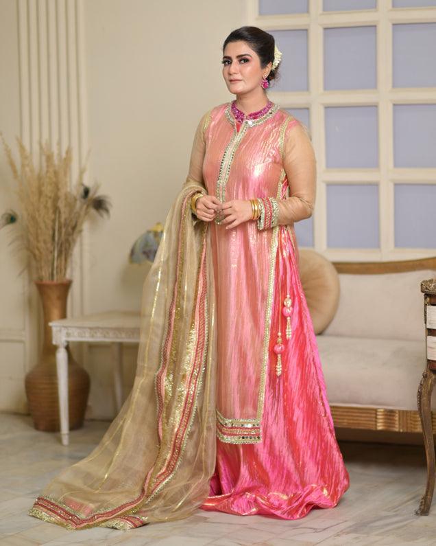 Bahar Bano - A Pink chan Embroidered organza kalidaar frock embellished with mirrors and gota laces intricately pleated sleeves paired up with crush shimmery lehenga in contrast with Aqua gota embellished organza dupatta.
