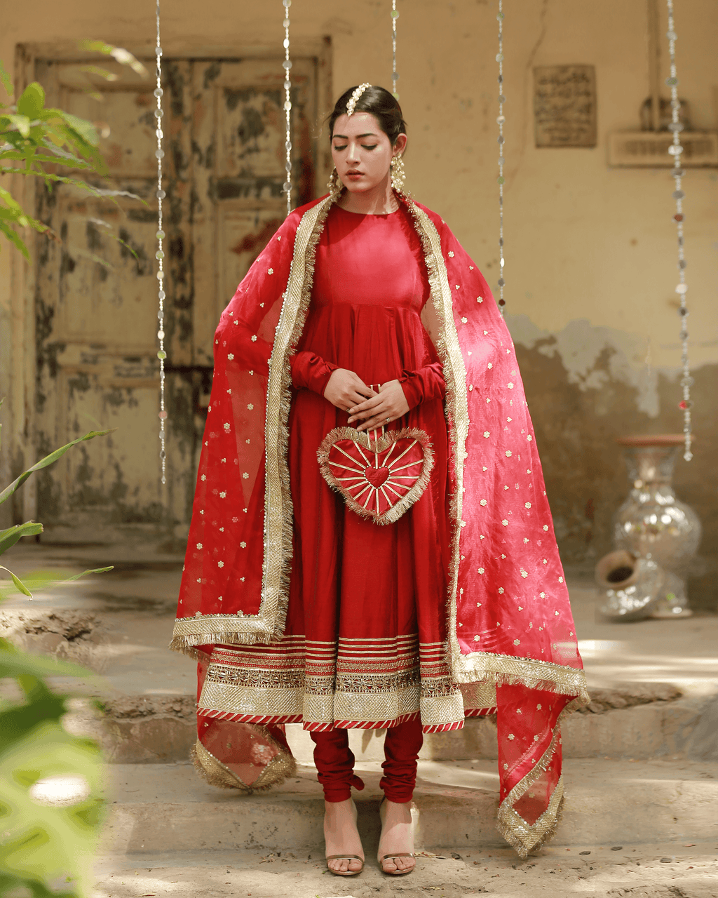 Gulkand - Long Deep Red kalidar with heavy lace embellished daman, churidaar sleeves and deep back neck with handmade gota latkans styled with Churidaar payjama and chan embroidered organza lace embellished dupatta.