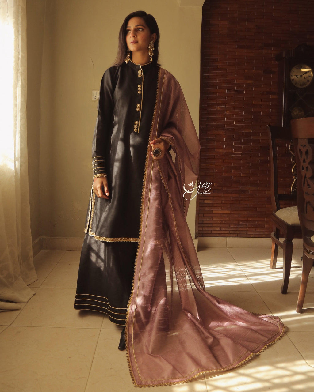 Morzaadi - A formal outfit includes a deep teal tunic paired up with dhaka payjama embroidered with tamba gota phool patti with pearls, styled with dupatta with gota handmade tassels. Includes: Shirt, Pant, Dupatta Fabric: Cot...