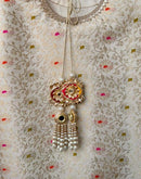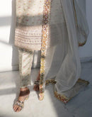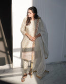 Qais - An Off-white Brocade set with intricate multi florals embellished with fine embroidered laces and handmade latkan paired with Gota edged organza dupatta.