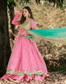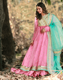 Bahar Bano - A Pink chan Embroidered organza kalidaar frock embellished with mirrors and gota laces intricately pleated sleeves paired up with crush shimmery lehenga in contrast with Aqua gota embellished organza dupatta.