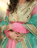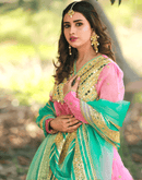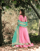 Bahar Bano - A Pink chan Embroidered organza kalidaar frock embellished with mirrors and gota laces intricately pleated sleeves paired up with crush shimmery lehenga in contrast with Aqua gota...