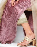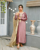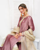Pleated Silk Tunic Set embellished with Laces and beads paired with contrasting Zari Net Dupatta and off-white raw silk lace bordered straight pants. Color: Mauve, Gold, off white Fabric: Silk, net, rawsilk  Swipe...