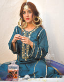 Morzaadi - A formal outfit includes a deep teal tunic paired up with dhaka payjama embroidered with tamba gota phool patti with pearls, styled with dupatta with gota handmade tassels.