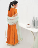 Pleated Silk Tunic embellished with laces and ruffle hem paired with contrasting organza dupatta and formal Raw silk boot cut pants. Color: orange, mint, off white  Fabric: silk, organza, raw silk ...