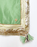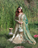 Sunheri - A Classic tissue Gharara set includes flared classic gharara with knee length shirt styled with contrasting dupatta embellished with Gota laces and handmade latkans.