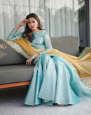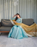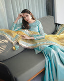 Kaif - A Classic cut Tissue Gharara set includes flared gharara with knee length shirt styled with organza dupatta embellished with Gota laces. Includes: Shirt, Pants, Dupatta  Color: Aqua, yellow Swipe...