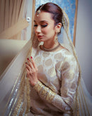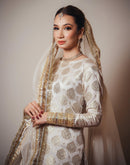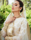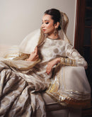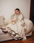 Saahiba - An old School flared satin brocade Gharara with knee length shirt styled with white organza Gota embellished dupatta and handmade latkans.