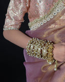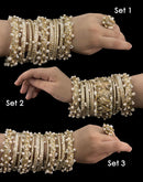 These handcrafted gota pearl bangles feature intricate detailing, combining traditional gota work with high-quality pearls for a luxurious and elegant look. These lightweight accessories are perfect for adding a subtle sparkle to any outfit.