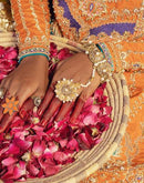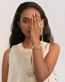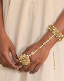 Handmade Hathphool Bracelet with an attached Ring handmade using Gota and pearls.