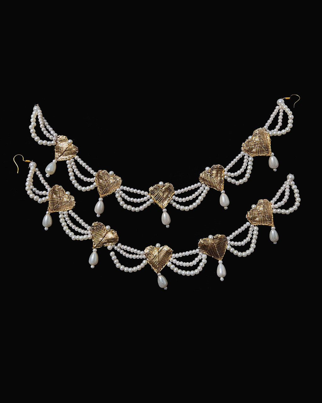 Dil Saharay - Handmade ear chains made in Dil shaped tamba gota embellished with quality pearls.