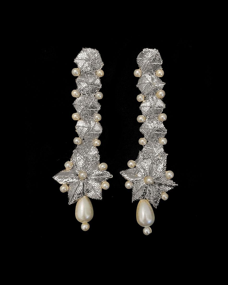 Bandki Silver Drop Earrings Handcrafted with Tamba Gota embellished with drop pearls.