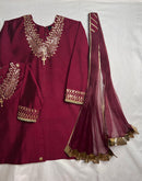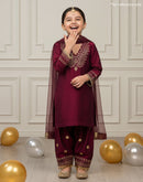 A cotton-silk kameez shalwar with fine hand embroidery on the neck, sleeves, and leg opening, styled beautifully with a pleated organza dupatta for your little girl.