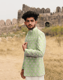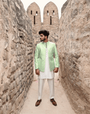 Mint self-print Brocade prince coat embroidered with contrasting white honeycomb pattern, stitched to perfection!