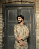 Classic festive wear kurta made in Tehra Atlas brocade fabric with loop button neck styled with bronze tissue formal pants.