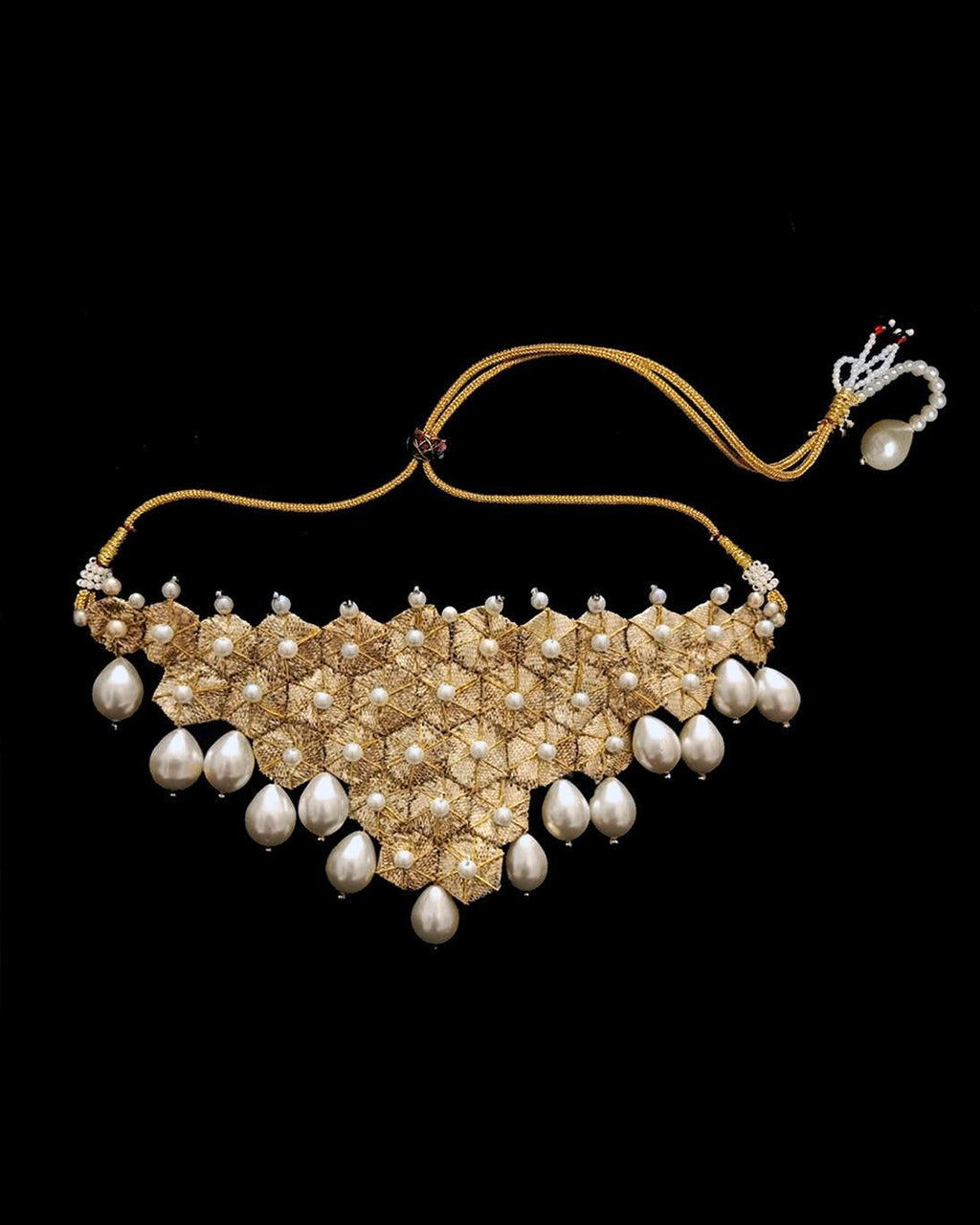 Shams Choker Necklace handmade with Tamba Gota and embellished with pearls.  A Necklace Color: Golden Closure: Slide Clasp