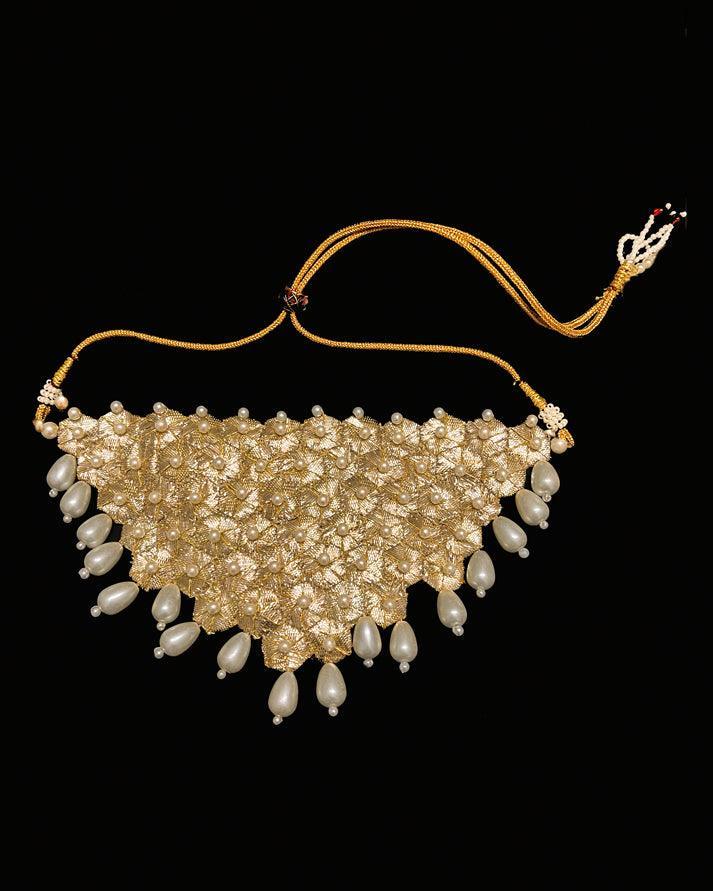 Aad Heavy Collar Necklace handmade with Tamba Gota and embellished with pearls.  A Necklace Color: Golden  Closure: Slide Clasp