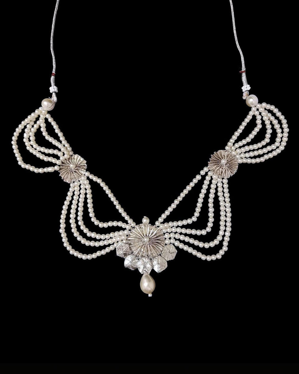 Silver Raani Haar Necklace Handcrafted with Tamba Gota and embellished with pearls.  A Necklace Color: Silver  Closure: Slide Clasp