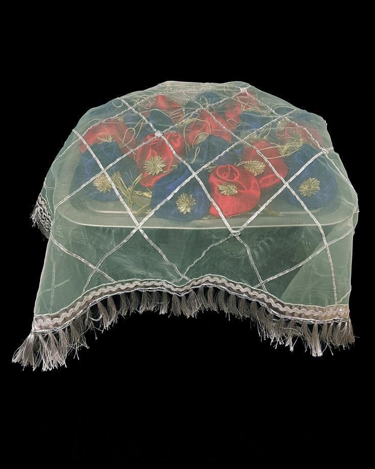 Square Thaal cover made in Organza fabric embellished with Gota and laces.