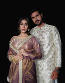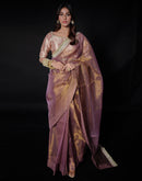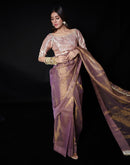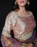Laraah - A Sheer Mesuri saree adorned with pearl and fringe laces, paired with a trendy-cut blouse crafted from atlas brocade, featuring subtle handwork making this ensemble ideal for special occasions and weddings.