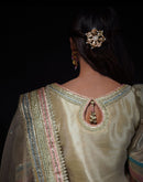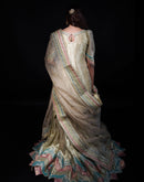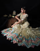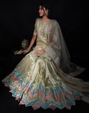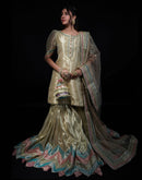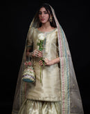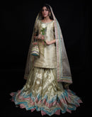 Laqaa - Crafted with shimmering golden tissue fabric, the gharara features an exquisite 10-yard flare. This outfit highlights the artistry of the patchwork technique in pastel chevron patterns which enhances the hemline and sleeve openings, adding a touch of heritage to the design. The sleek kameez complements the voluminous gharara, while the intricately hand embellished dupatta adds texture and balance.