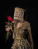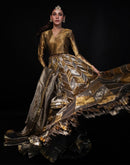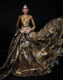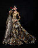 Zayna - A blend of antique bronze and deep grey, this tissue lehenga embodies vintage opulence with a contemporary soul. The intricate gota patchwork in chevron patterns shimmers with movement, and a...