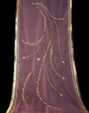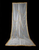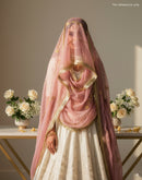 A 3-yard organza Nikkah dupatta, delicately adorned with intricate hand-embroidered blessings for the bride. Both the colors and text can be customized.