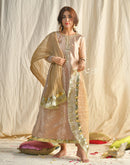 Konpal - A formal 3 piece outfit includes Rose pink tissue Kalidar frock with hand embroidered Gota work and texture on sleeves and straight pants paired up with beige crushed dupatta bordered with Gota and tassels.