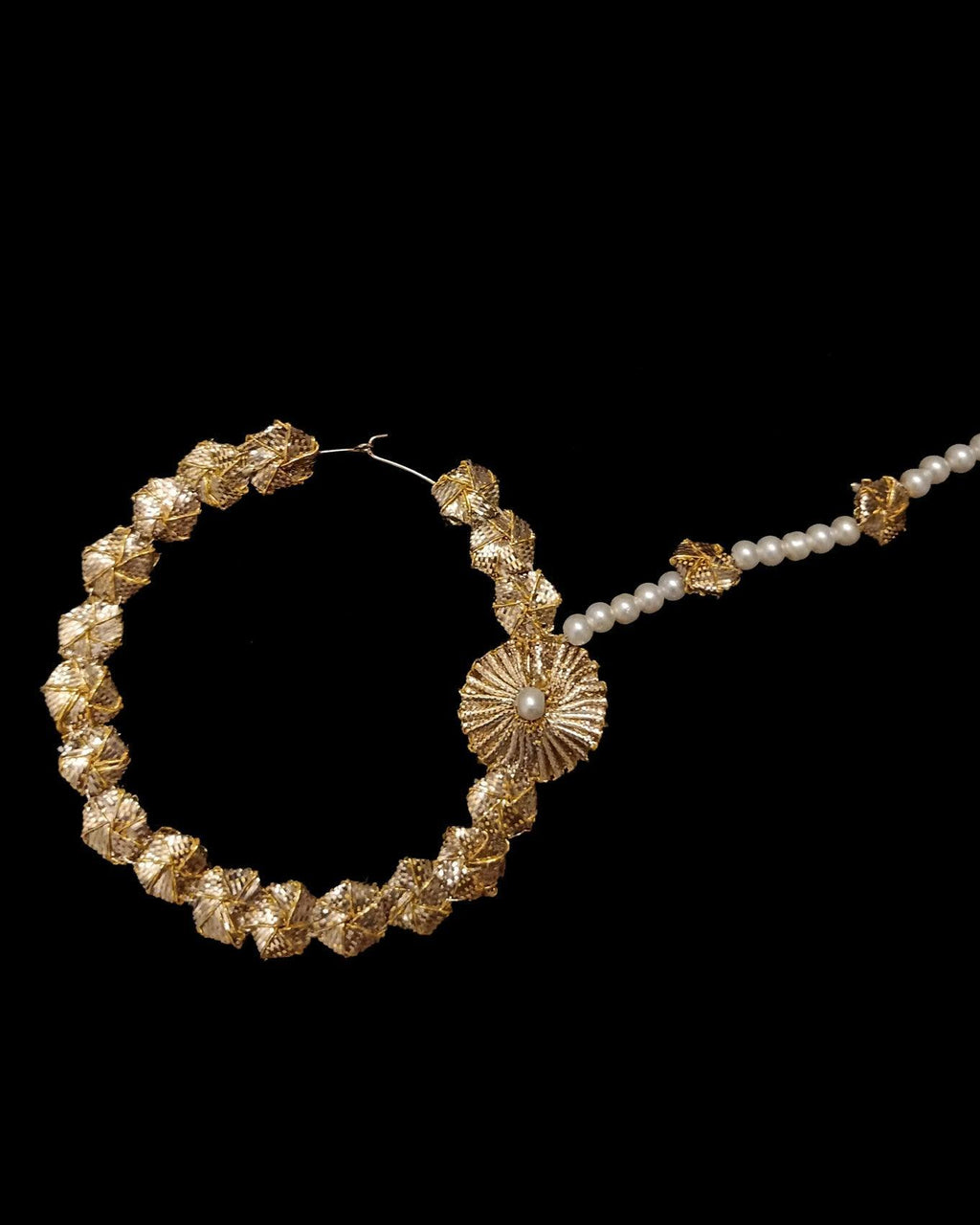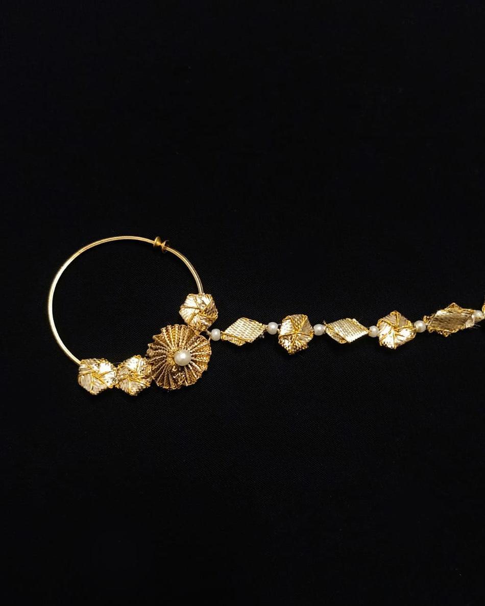 Handmade Nath designed with Tamba Gota and embellished with pearls.