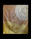 In this handcrafted Maru Mahotsav inspired tapestry, the golden pointed structures are depicting sand dunes of Thar desert made with golden crinkle gota above which is the full moon embroidered with silver gota creating a fairytale ambiance with rough textured rose gold background depicting the sky of the desert who has witnessed all the hardships desert has gone through until the bloom of this festival.