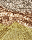 Size: 31x37 inches To Hang: Straps In this handcrafted Maru Mahotsav inspired tapestry, the golden pointed structures are depicting sand dunes of Thar desert made with golden crinkle gota above...