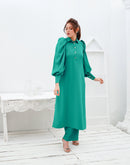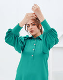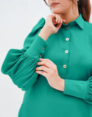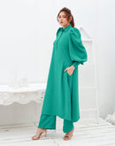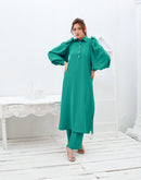 Persian Green Set includes Long Shirt with Extragrated puff sleeves and little golden button details paired with pants designed with slant pockets made in wrinkle-free crepe fabric.