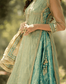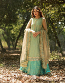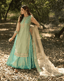 Arjumand - A Golden Net shirt embellished with Mirror and Gota laces styled with handmade side dori tassels paired up with shimmery crush turquoise long inner shirt and lace embellished Golden net dupatta.
