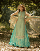 Arjumand - A Golden Net shirt embellished with Mirror and Gota laces styled with handmade side dori tassels paired up with shimmery crush turquoise long inner shirt and lace embellished...